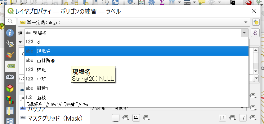 表示できるのは1つのフィールドだけではありません、次に面積も一緒に表示させてみましょう。
