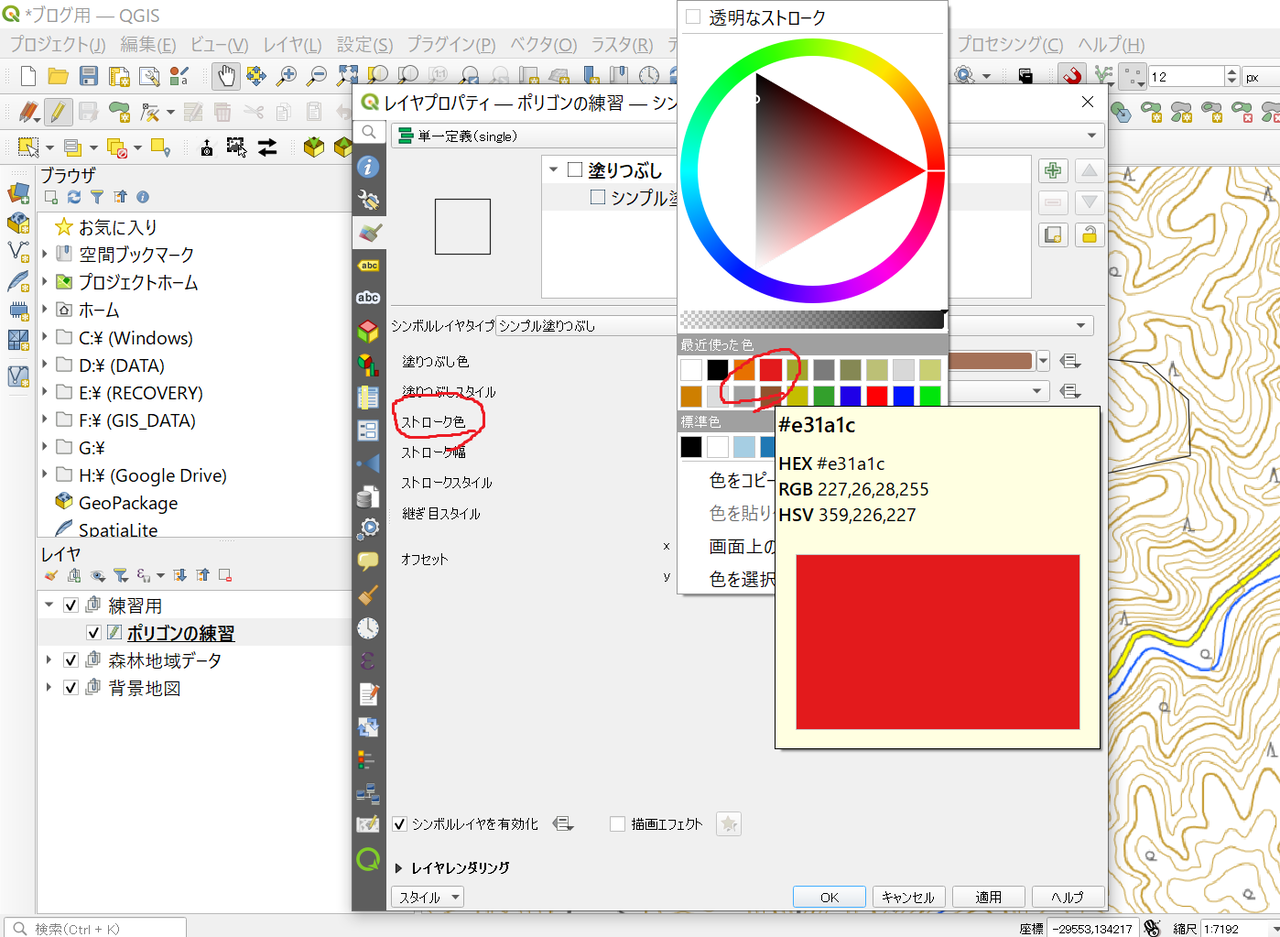 ここで色分けをするために仮の色付けをします。図のようにレイヤーを右クリックしてプロパティ→シンボロジーの調整と進みシンプル塗りつぶし→塗りつぶしでOKです。