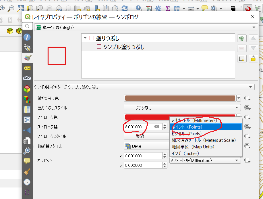 レイヤのプロパティで左の3つ目のタグ シンボロジーを調整を選択し、シンプル塗りつぶし、ブラシなしと選択してOKをクリックです。