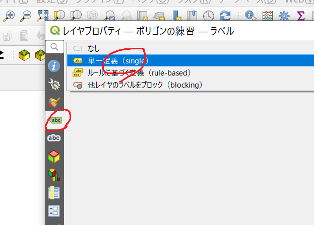 ※図ではラベルも表示されるように変更しておきました。ラベルで指定している面積のデータが抜けている属性データがラベルの表示に失敗していたからです。フィールド計算機で再計算して再表示されるようになりました。
