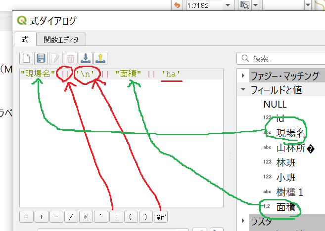 式を書いていきます、キーボードで入力しても同じですが、真ん中の列からフィールドと値にフィールド名が入っているのでそれをダブルクリックすると"(ダブルクォーテーション)で囲まれて式に入力されます(図の緑の線)下の段の演算子はシングルクリックで入力できます(図の赤い線)。